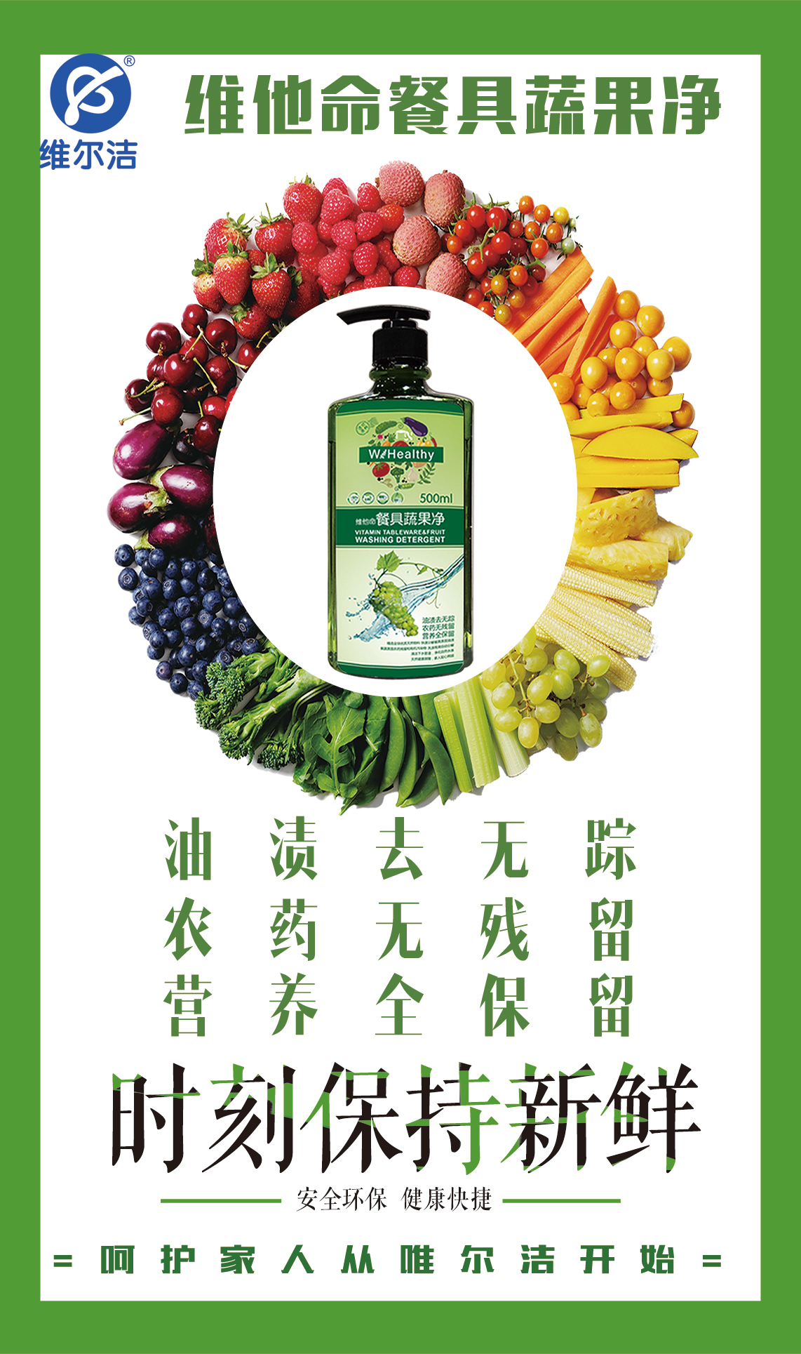 维尔洁W-healthy餐具蔬果净纯植物洗洁精单瓶装500ml 赠旅行装